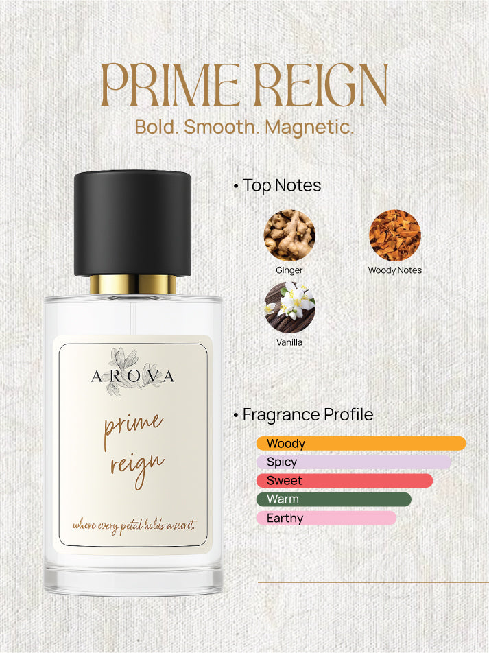 A fragrance for the one who leads without asking for permission. Prime Reign opens with the fiery energy of ginger, settles into a commanding core of rich woods, and finishes with the smooth warmth of sweet vanilla.
